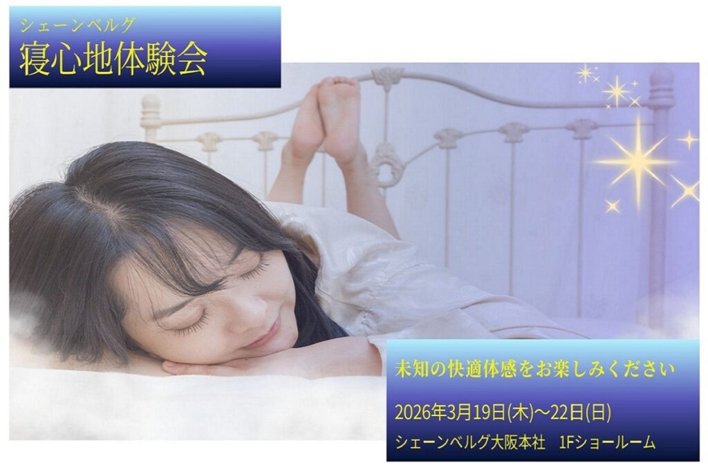 このたび、3月19日(木)~3月22日(日)の4日間、シェーンベルグ大阪本社1Fショールームにて 「寝心地体験会」 を開催いたします。